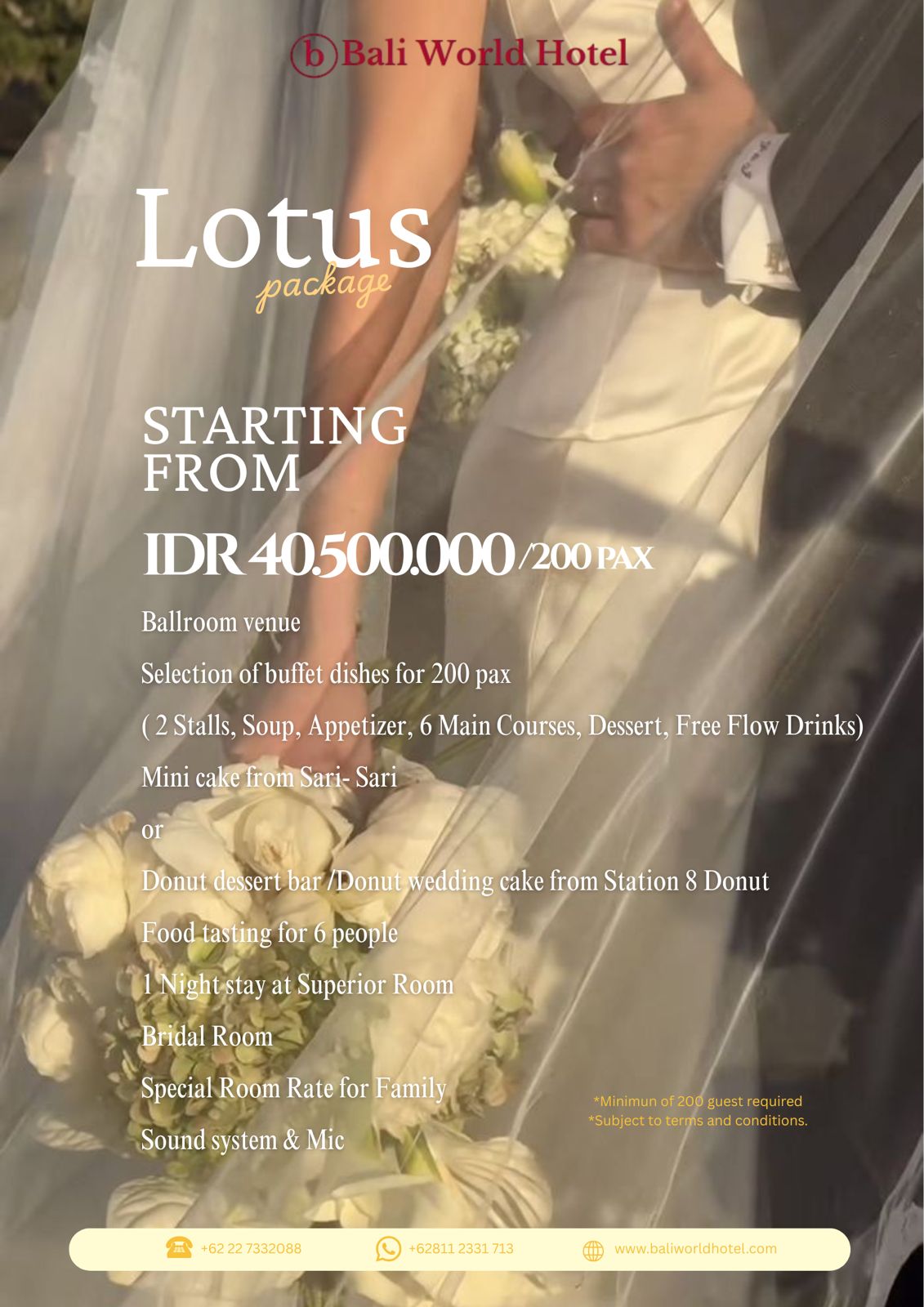 Every love story deserves a grand beginning, one filled with elegance, joy, and unforgettable moments. Bali World Hotel brings that vision to life with a beautifully curated experience designed for larger celebrations.Held in our spacious and versatile Orchid Ballroom, the hotel offer a sophisticated setting complete with a layout that accommodates bigger guest lists with comfort and style. Couples can enjoy a wide selection of menu options crafted by our talented culinary team, along with attentive service from our dedicated colleagues. Whether you imagine a classic celebration or a modern, personalized atmosphere, our team ensures everything flows seamlessly from start to finish.