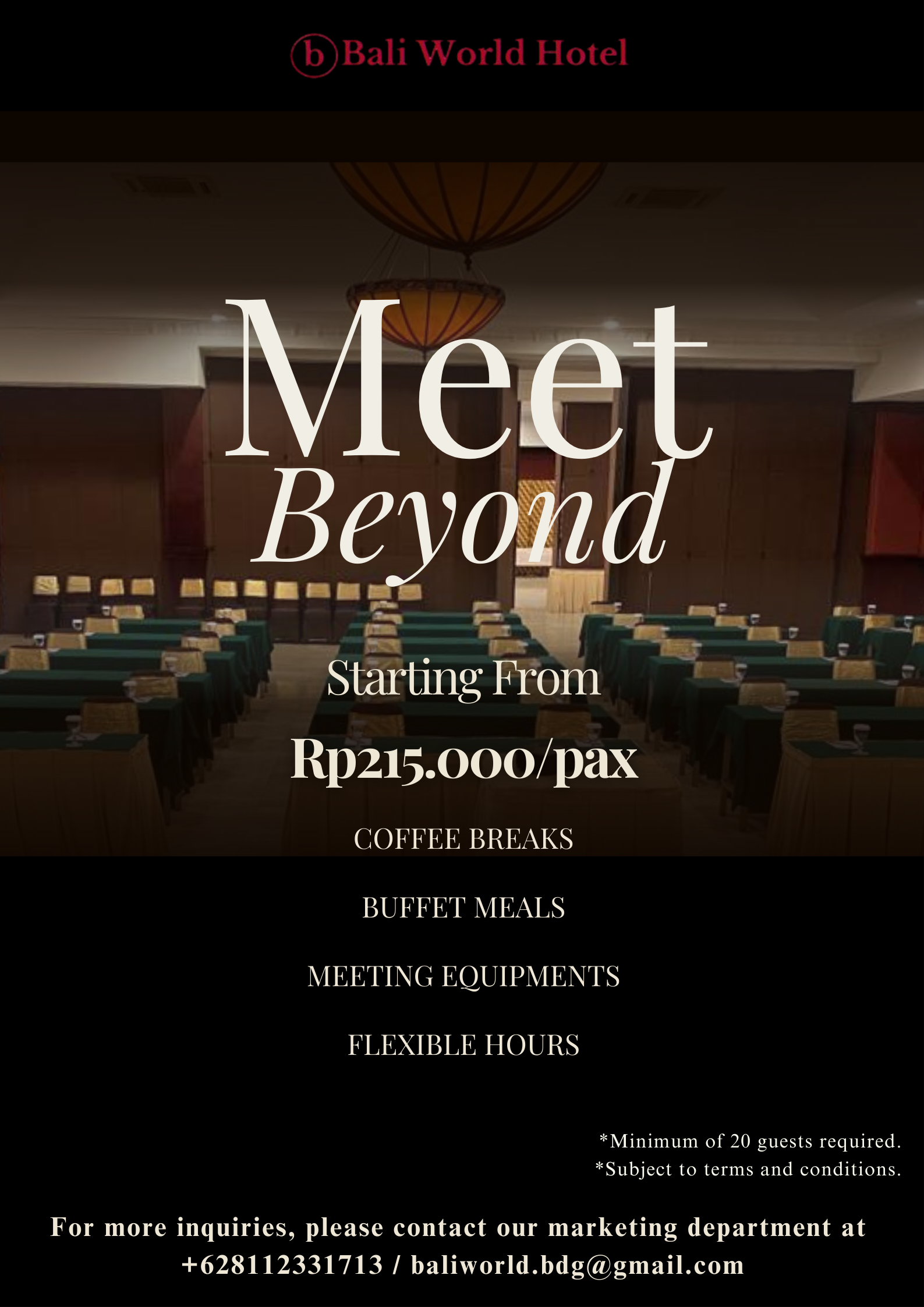 At Bali World Hotel, we offer more than just a venue, we create an environment where ideas flow and goals are achieved. Whether it's a board meeting, corporate seminar, strategic retreat, or brand launch, our event spaces provide the perfect mix of functionality and elegance.